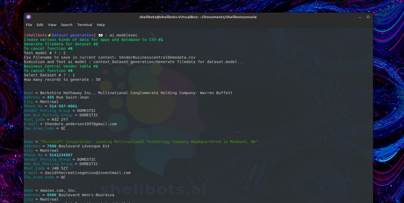 À partir de Shellbots, nous avons combiné la création d’un service d’IA pour générer les données avec une configuration à la demande permettant de générer tout type de données, y compris des images, etc. Vous pouvez définir les structures que vous souhaitez avec pour chaque champ des tables des prompts spécifiques. L'outil vous demande ensuite combien de données vous souhaitez générer. Un vrai accélérateur pour vos projets